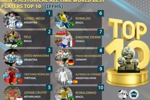 体育资讯05月18日讯 著名足球统计机构IFFHS(国际足球历史和统计联合会)发布足球历史最佳评选,其中梅西第1,贝利老马2、3,C罗第4。