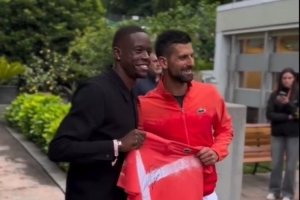 比赛之余,德约科维奇和瑞士足球运动员扎卡里亚碰面,德约科维奇向扎卡里亚送上了签名球衣。