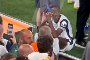 在终场前,萨尔紧张得一直抖腿不敢看比赛。终场哨吹响后,终于放松,忘情奔跑像个孩子一样的庆祝。