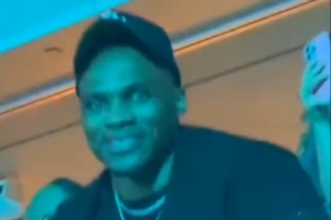威少现身说唱歌手肯德里克-拉马尔全国巡回延迟洛杉矶站,心情看起来很不错。