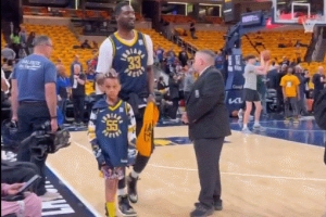 前NBA中锋希伯特带儿子现身主场支持步行者。