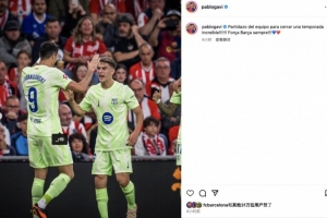 赛后,巴萨中场加维更新社媒:“球队以一场精彩绝伦的比赛为这个不可思议的赛季画上句号!!!!!! 巴萨永远加油!!!💙❤️”