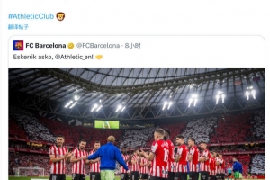 赛后巴萨官推晒出毕尔巴鄂赛前列队照,并用巴斯克语配文写道:“谢谢你们,毕尔巴鄂竞技!”