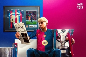 海报中,年仅17岁的亚马尔已坐拥众多冠军奖杯和个人奖项,1座欧洲杯、两座西甲联赛冠军、1座国王杯、1座西班牙超级杯、金童奖、科帕奖等等。