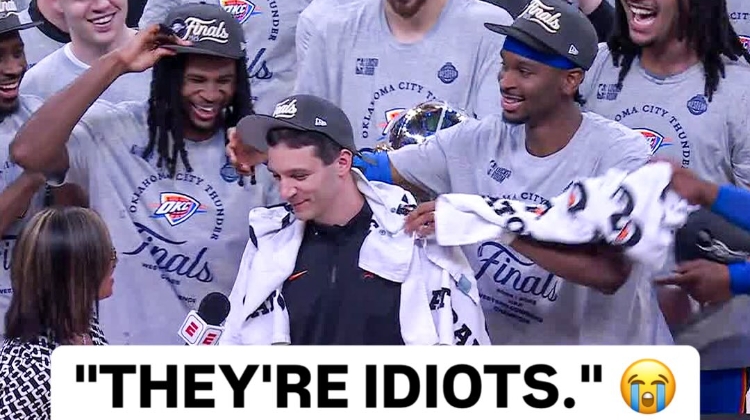 在赛后颁发西部冠军与西决MVP奖杯后,雷霆主帅戴格诺特接受采访,队员们开始了经典的恶搞:披毛巾、戴歪帽。