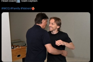 克罗地亚官推晒出莫德里奇与主帅的合照,并配文:“主教练拥抱队长。”
