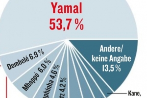 体育资讯6月2日讯 据《踢球者》报道,近期由216名德甲球员投票,选当今世界最佳进攻球员,亚马尔以53.7%的得票率名列榜首。