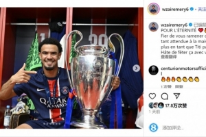 扎伊尔-埃梅里社媒晒出与奖杯的合照,配文:“永恒的荣耀!很自豪将这座期待已久的奖杯带回家,作为一个巴黎人尤其如此。”