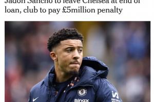 25岁桑乔租借合同中有2500万镑的买断条款,由于切尔西不会触发该条款,蓝军将向曼联支付500万镑违约金。桑乔将在今夏另谋下家。