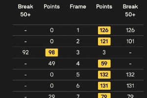 本场比赛,霍金斯在前8局就轰出了5杆单杆破百,以7比1的巨大领先优势结束第一阶段比赛。