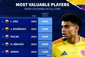 体育资讯6月7日讯 德国转会市场列出了哥伦比亚球员历史最高身价排名,路易斯-迪亚斯8500万欧居首。