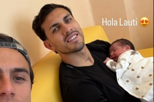迪巴拉社媒晒出与帕雷德斯的合照,后者怀抱着出生不久的孩子,迪巴拉配文:“祝贺我的朋友帕雷德斯和卡米拉(帕雷德斯妻子)。”