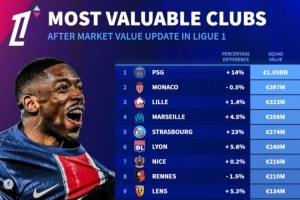 体育资讯6月10日讯 德转更新法甲球员身价,巴黎全队总身价10.5亿欧法甲最高,摩纳哥、里尔排在二三位。