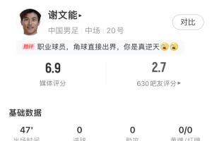 体育资讯06月10日讯 北京时间19:00,世预赛亚洲区第三阶段C组第10轮,中国男足对阵巴林,谢文能半场数据出炉。