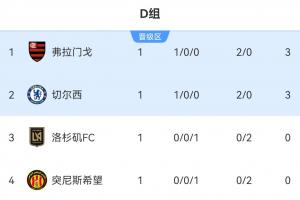 目前弗拉门戈暂居第一,切尔西第二,洛杉矶FC第三,突尼斯希望垫底。