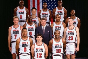 梦一队名单:乔丹、魔术师、巴克利、大卫-罗宾逊、尤因、伯德、皮蓬、德雷克斯勒、卡尔-马龙、斯托克顿、穆林、莱特纳。
