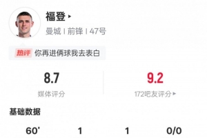 福登本场比赛具体数据如下: