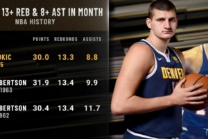 NBA历史上单月场均至少拿下30分13篮板和8助攻的球员: