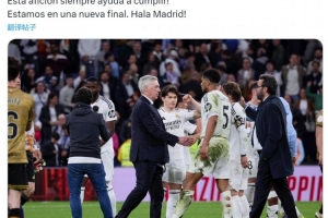 皇马主帅安切洛蒂社媒晒照庆祝胜利,他写道:“这群球迷总是能帮助我们实现目标!我们又进入决赛了,Hala Madrid!”