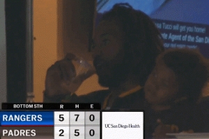 视频中小卡和孩子在包厢内观看美职棒圣地亚哥教士和得州游骑兵的比赛,他拿着饮料满脸笑容,看来心情不错。