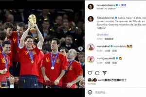 托雷斯社媒写道:“15年前,我们一起在南非成为了世界冠军,那一天的美好回忆载入史册!”