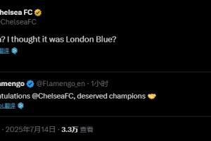赛后,本届赛事中唯一一支战胜了切尔西的球队弗拉门戈向他们送上了祝贺:“恭喜切尔西,配得上冠军🤝”,切尔西官方则回复到:切尔西?不是伦敦蓝队?
