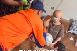 韩鹏代表球队送给了这名小球迷全队的签名足球,并祝福这名小球迷早日康复。