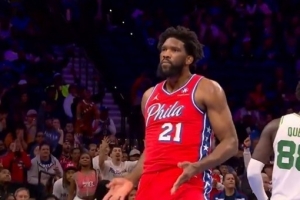 虽迟但到!恩比德VS绿军打成2+1后做出大尺度庆祝动作 被罚5万刀