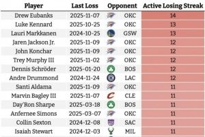 现役球员面对一支球队连败榜 雷霆刷屏 威少面对森林狼10连败