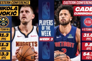周最佳:约基奇场均31.3分11.3板13.3助大号三双 CC率队4胜0负