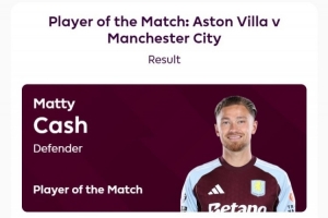 打进制胜球,卡什当选维拉vs曼城全场最佳球员